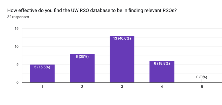 I conducted a user survey via Google Forms, gathering 33 responses from current undergraduate students at UW through snowball and convenience sampling to understand student experiences with current RSO discovery and management tools.