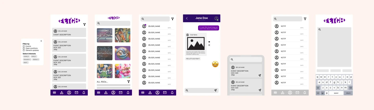 This is the mid-fidelity flow for the student feed, explore page, and messaging page.
