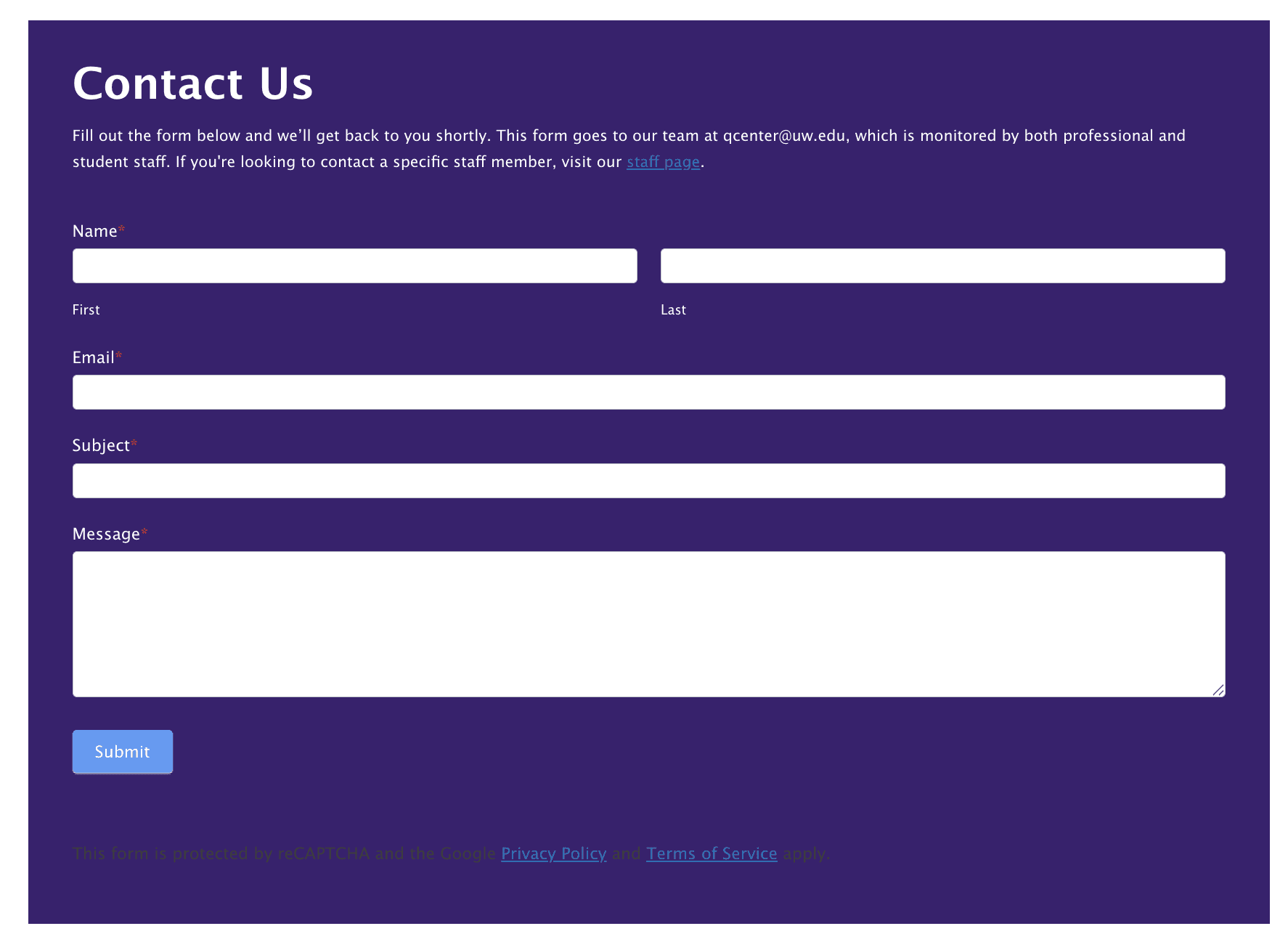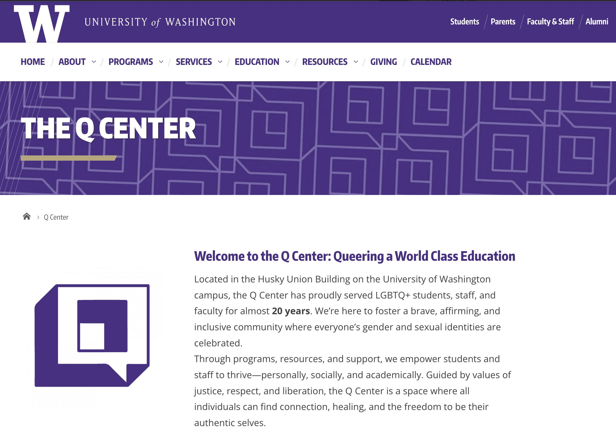 The Q Center's mission is to support the wellbeing of LGBTQ+ students at UW through events, programs, and educational content. However, the previous homepage design made it difficult for students to quickly answer the question: "What's going on at the Q Center this week?". Educational blog posts received very low engagement because of a lack of visibility. In addition, the previous design didn't effectively convey the spirit of belonging and joy that the Q Center embodies.